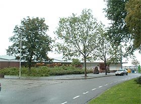 bij. Aan de kant van de bestaande bebouwing verscholen achter de supermarkt